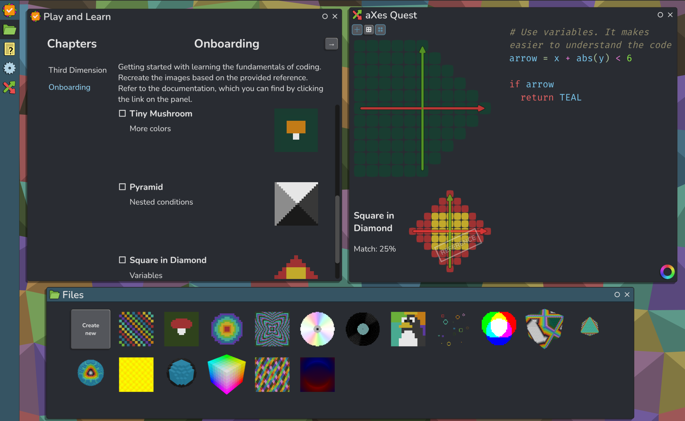 aXes Quest is an interactive playground for learning the basics of programming and generative art. Here, math, code, graphics, and animation are explored through play. In generative art, every idea becomes a creative experiment, and sometimes mistakes turn out more interesting than the original plan.