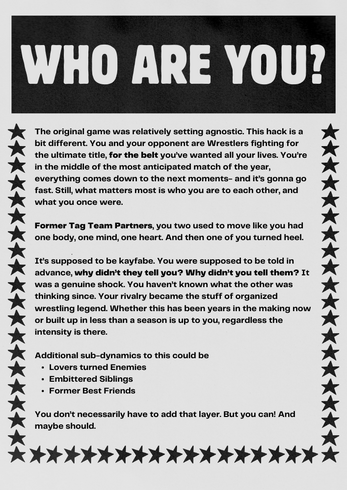 For the Belt is a hack of We Were One, inspired by WWE and the TV Show “WWE Rivals”, designed for Cutestpatoot’s Game Design Week, 2025.