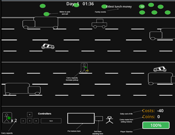 Further update: Very interesting game, I like the take on the theme and the frogger-esque gameplay crossed with cost-management was a really fun idea, though I did find picking up the melons to be a little bit slow.