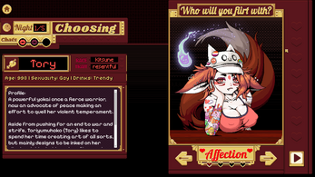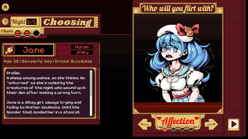 There will be 6 women you may to choose to flirt with during Primrose's workweek, which is made up of 5 nights. The goal of this game is to successfully earn the affection of one of them, and to achieve this you must build up 4 points of affection by chatting with them flirtatiously. You are allotted 3 chats per night.