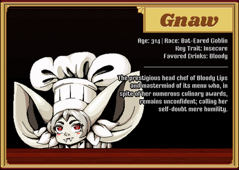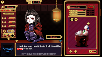 In this urban fantasy setting, vampires have made themselves a regular fixture in society, with systems and establishments uniquely theirs. Bloody Lips is one such example, an elegant bar with blood-infused drinks on offer made by vampiric mixologists, some more creative than others. These drinks may be as tame as an old-fashioned knock off with a squirt of blood, or as unhinged as testicles swimming in a glass of blood mixed with gin. If vampires are slurping up balls, or any meat for that matter, they like it raw.