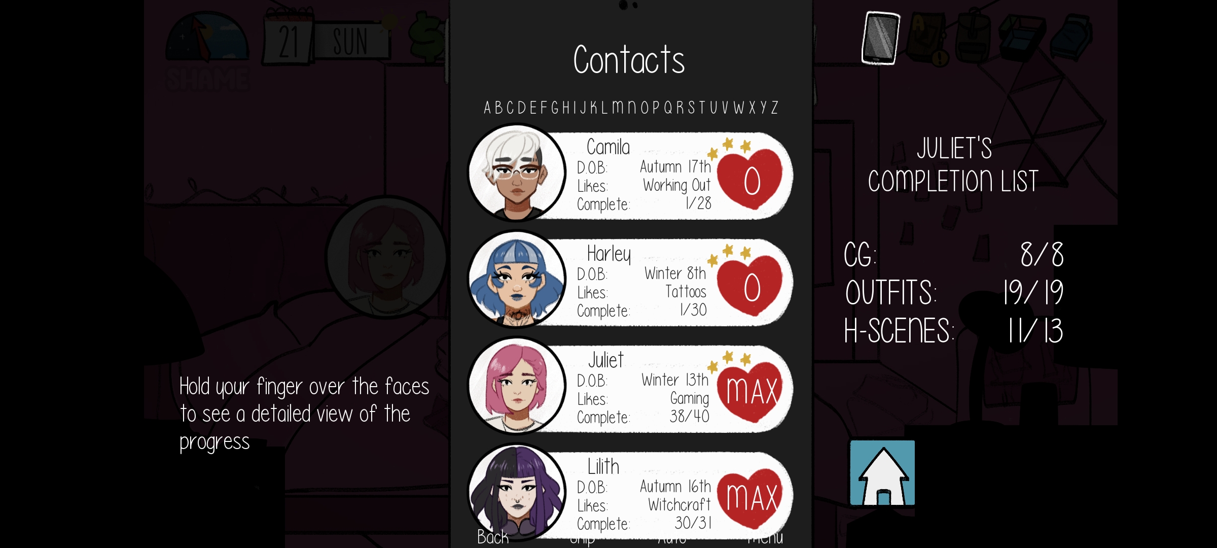 I've got all girls (except quinni) up to level 24+ and done all the events of 0.16a. Each one still says I have scenes to unlock and now I'm stumped. For example, with Lilith I have level 24, cg 8/8, outfits 8/8, h-scenes 10/13. Do I need to keep leveling the girls until like 50 or something?
