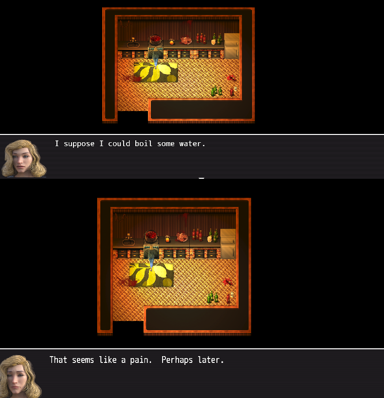 Presentation is a 1 star, mostly because there are problems with the passability of some of the sprites. There are some tiles, like in the kitchen where I should be able to be able to step in, and some, where I shouldn't, like a blood sprite in the basement. The screenshots in the game page are the only maps in the demo as far as I played (I did 3 times just to make sure I didn't miss anything). But I do like where his thoughts are going, though. I think whatever he's making has potential if he puts time on this. Everything just seems unique. That's the only reason I added one start to the total score.