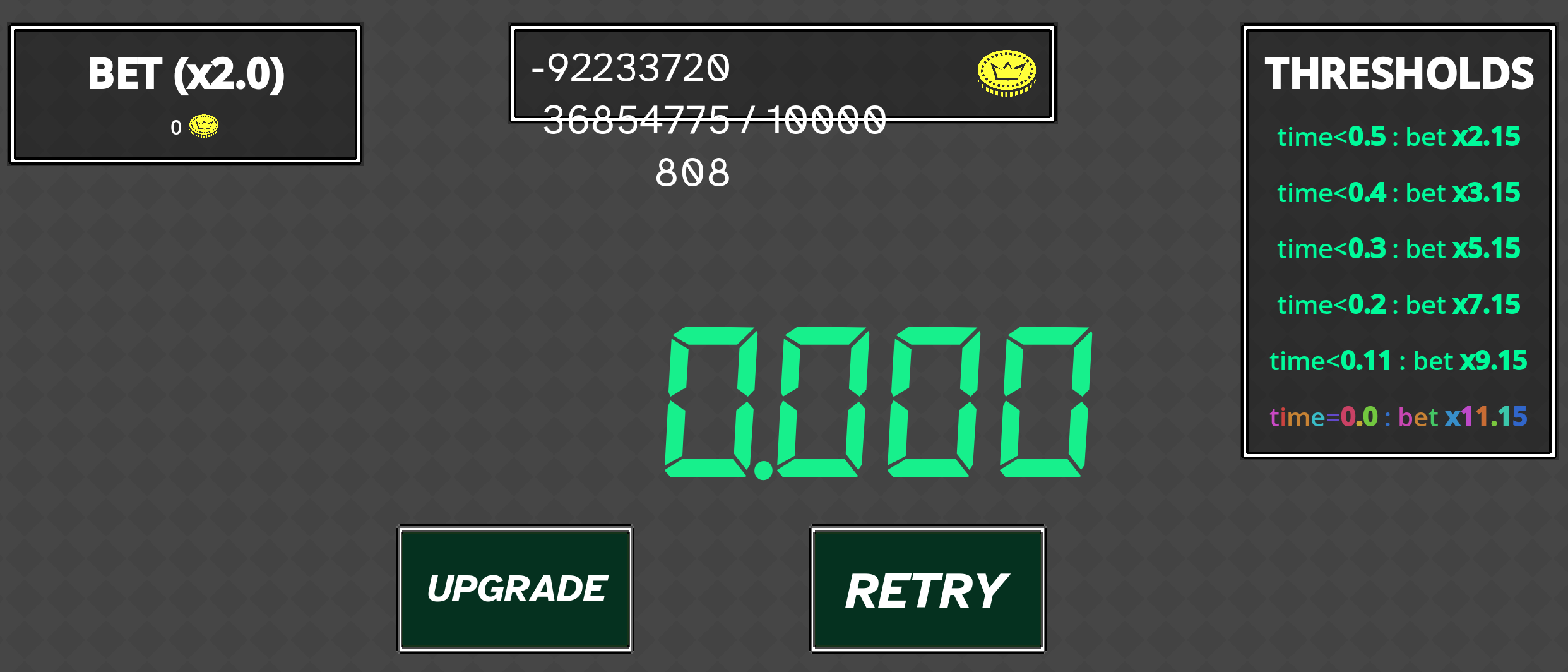 This absolutely has potential, and I have one further suggestion; See if you can synchronise the timer to the music itself. I found myself grooving a little bit to help with my timings when it lined up (bpm lines up well to 60/120 which is great for Second timings) and if that READY UP phase was used to sync the timer to the beat that would be EXCELLENT. Great prototype, All In is definitely a little overpowered, but then what prototypes don't have broken stuff.