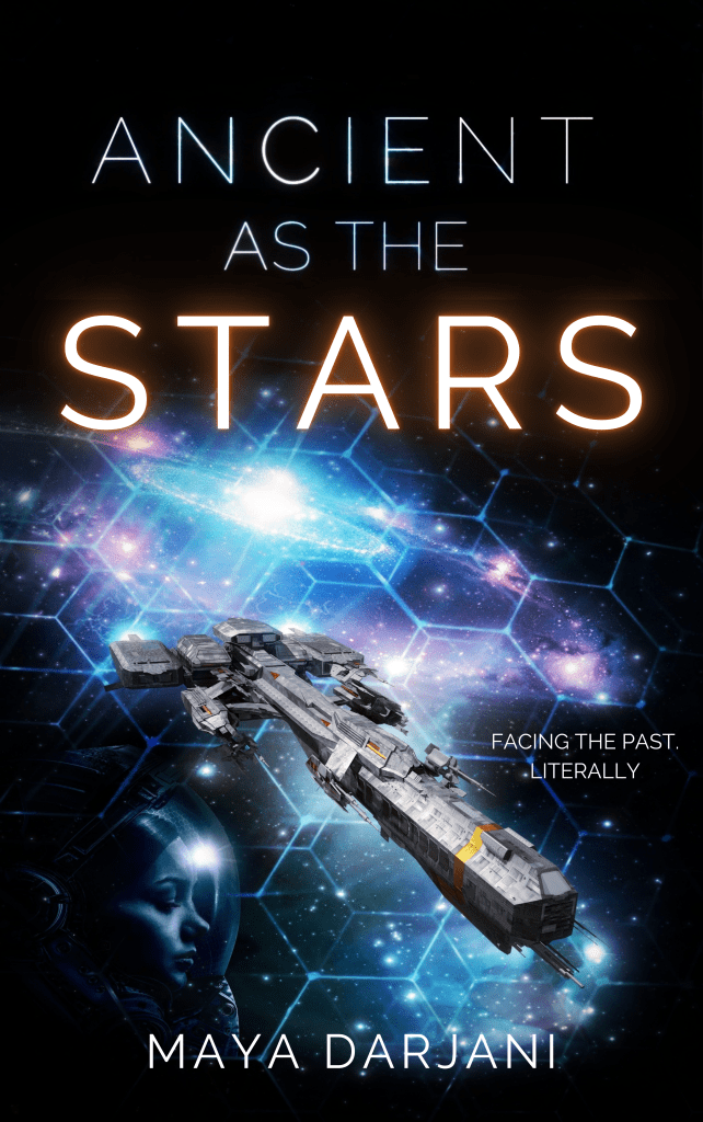 alt text: Cover of space opera book with the title of Ancient as the Stars. The words ‘Ancient as the’ are in white and the word ‘Stars’ is written in gold. The book cover features a spaceship, which is in a colorful nebula with a hexagon overlay behind it. There is a female astronaut figure on the lower left side. The tag line is in small text on the right and reads Facing the past. Literally. The author’s name, Maya Darjani, is written in white at the bottom center.