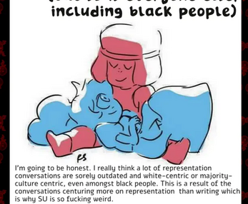 god, as someone who used to be and still kinda is a huge fan of SU and HH, this zine is so damn good.Im not Black ofc but Peurto Rican , but online discourse 4 years rlly has annoyed meand u perfectly said it!!! so much representation is only based around being "non problematic" that a lot of characters do end up being written... rlly boring. ive liked a TON of different media that writes hispanic ppl HORRIBLY (HH included) and yet i still love it! bc hey theyre like me! idk what im rlly getting at, this esay was a rlly good read and im happy to see more nuanced opinions on stuff like hh or su instead of just black and white thinking that either is fully bad or fully good