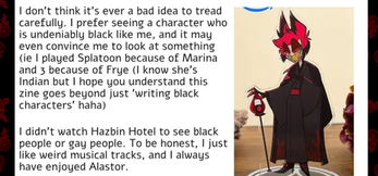 A reflective zine on the concept of representation, black characters creation guide, what it means, being the quietest in a minority group, and the eternal discourse wheel's impact on entertainment media using popular media (Hazbin Hotel and Steven Universe)