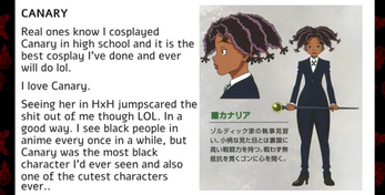 also love the shoutout to canary, my fave girl. (still im dead that you called krone her copycat...like you aren't wrong, but.......) currently, my favorite black rep from nonblack work is Gachikacta--the black cast is shining through and through