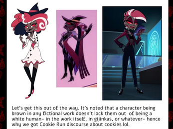 wasn't into steven universe, but am currently into hazbin as a fan in shades. (i like being mildly entertained by how bad it is lol) so i def felt the initial disconnect with velvette. it actually took me to the last episode of s2, for me to recognize that she's black, whoops.