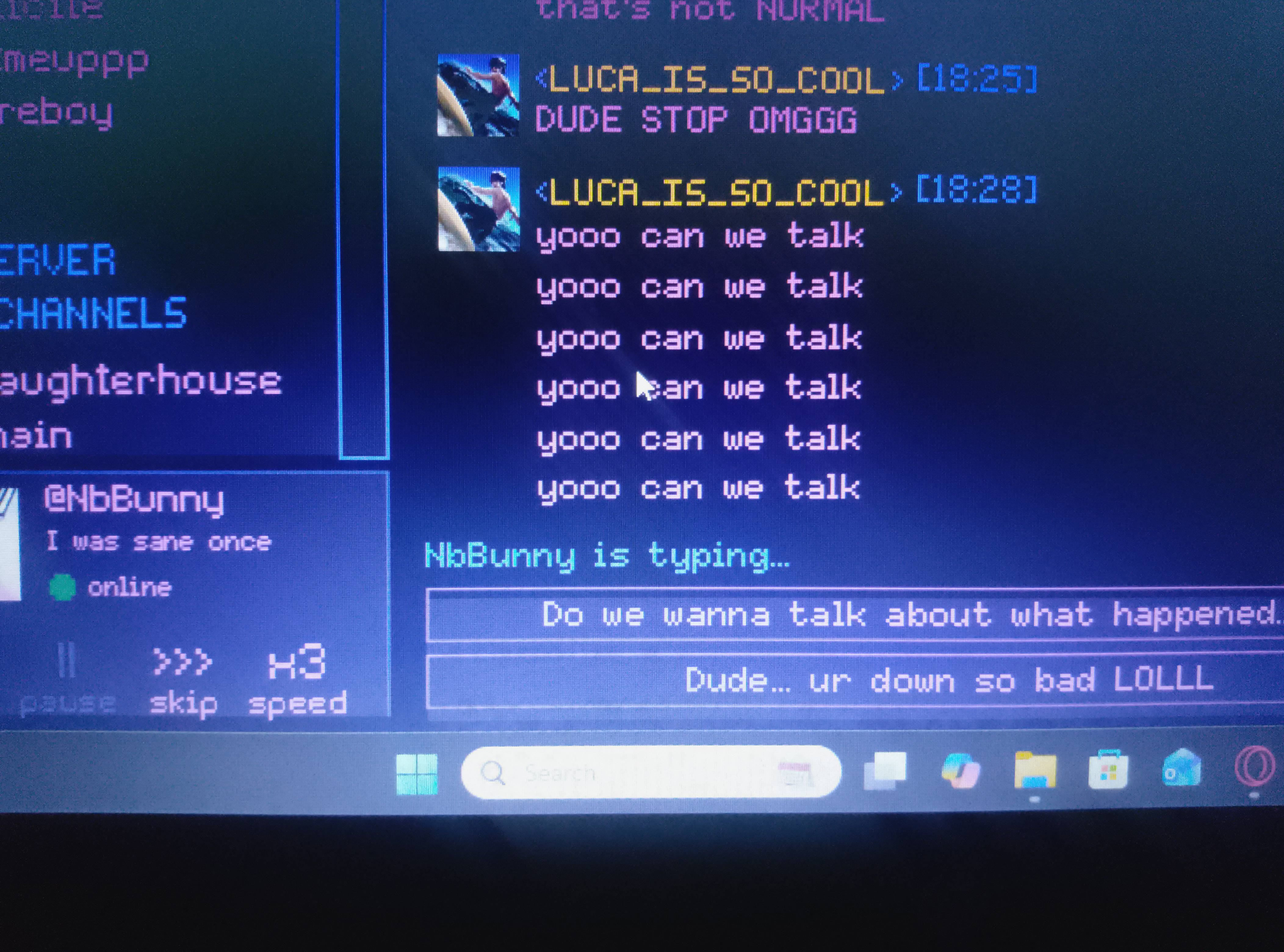 Hiiii, just popping in to notify of a bug where at month 4 when you get the option to choose between talking to luca or feli, the luca dming you first is bugged to where if you click off and then go back before responding it will show 2 of the message and so on