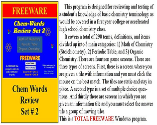 This FREEWARE program is a review of the Math of Chemistry, Per. Table, & Org. Chem. - 292 items are covered.
