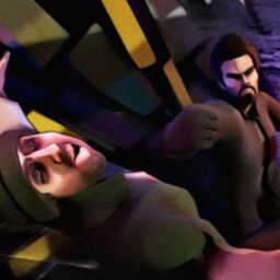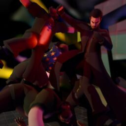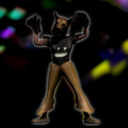 Grinning beast in shadows.