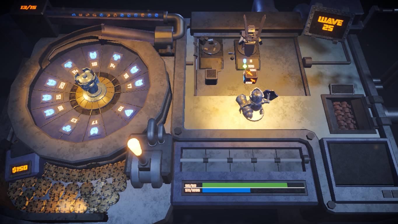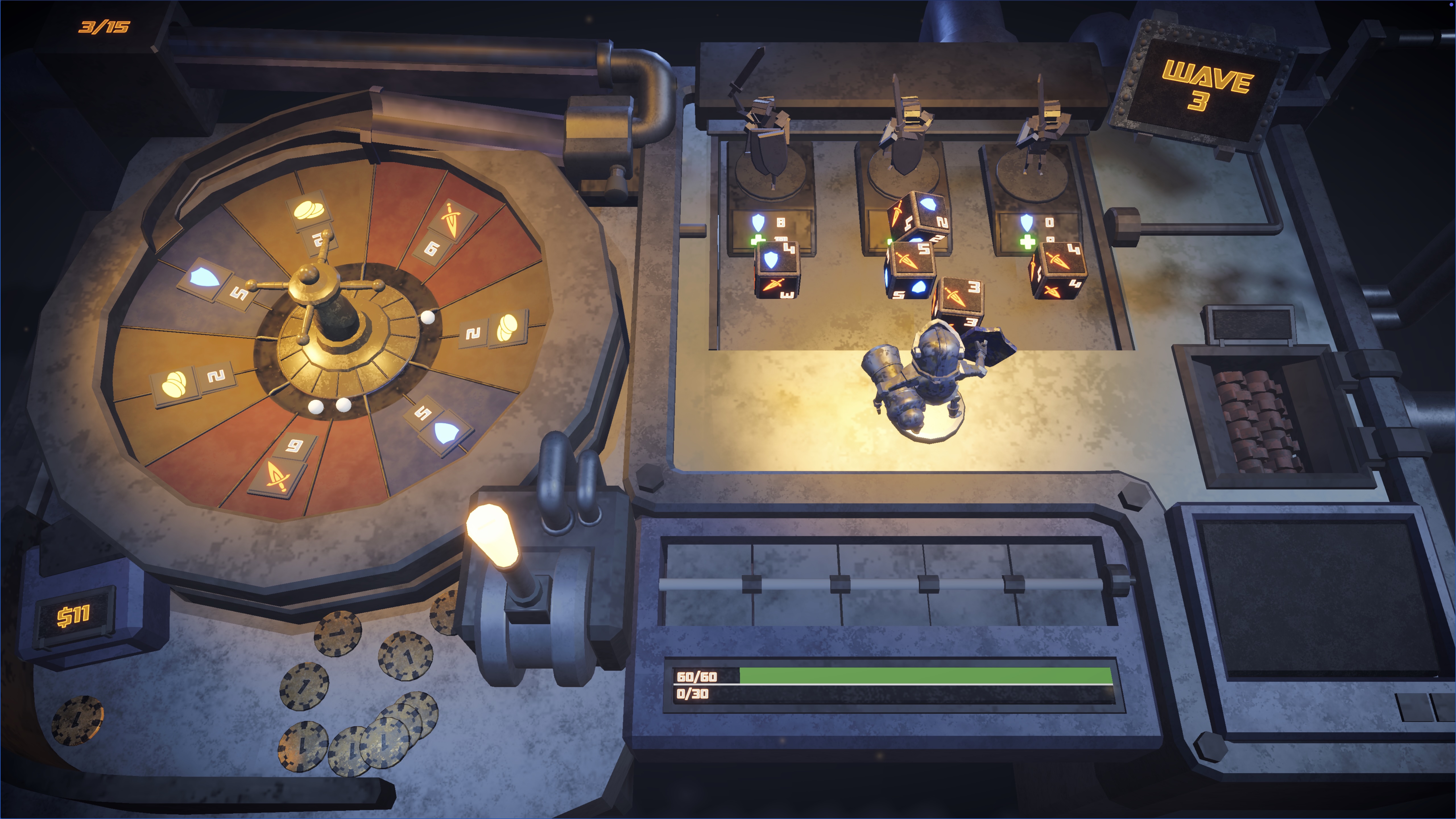 You play as a small figurine hero fighting through a mechanical tabletop dungeon. Each turn, the wheel decides what you get, attack, defense, gold, healing. Battle through encounters and see how long you can last.