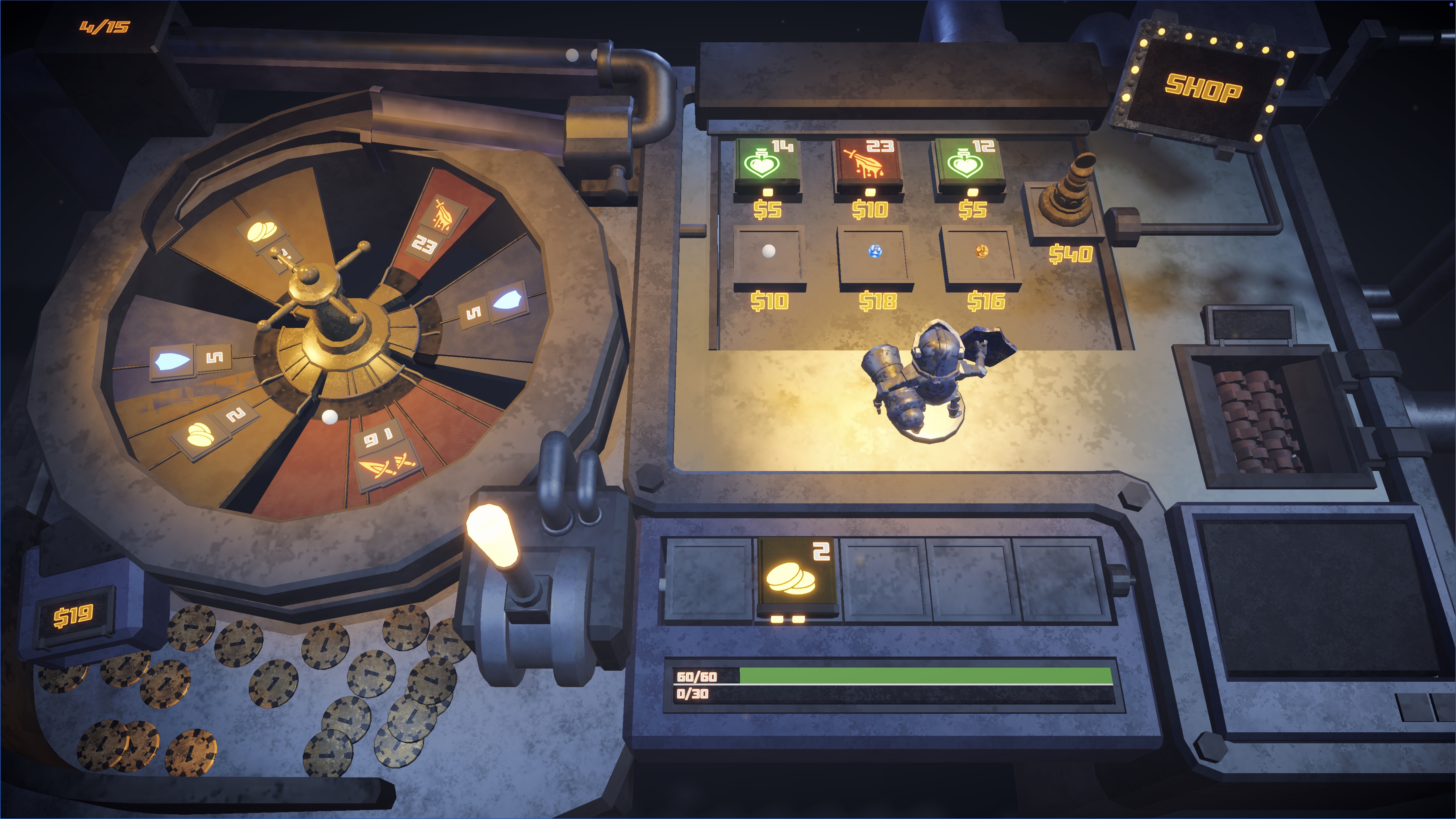However, small bug: When you press the lever too quickly after finishing the level, the roulette starts to spin and the first 3 balls get thrown in, making it impossible to change the roulette during that shop turn.