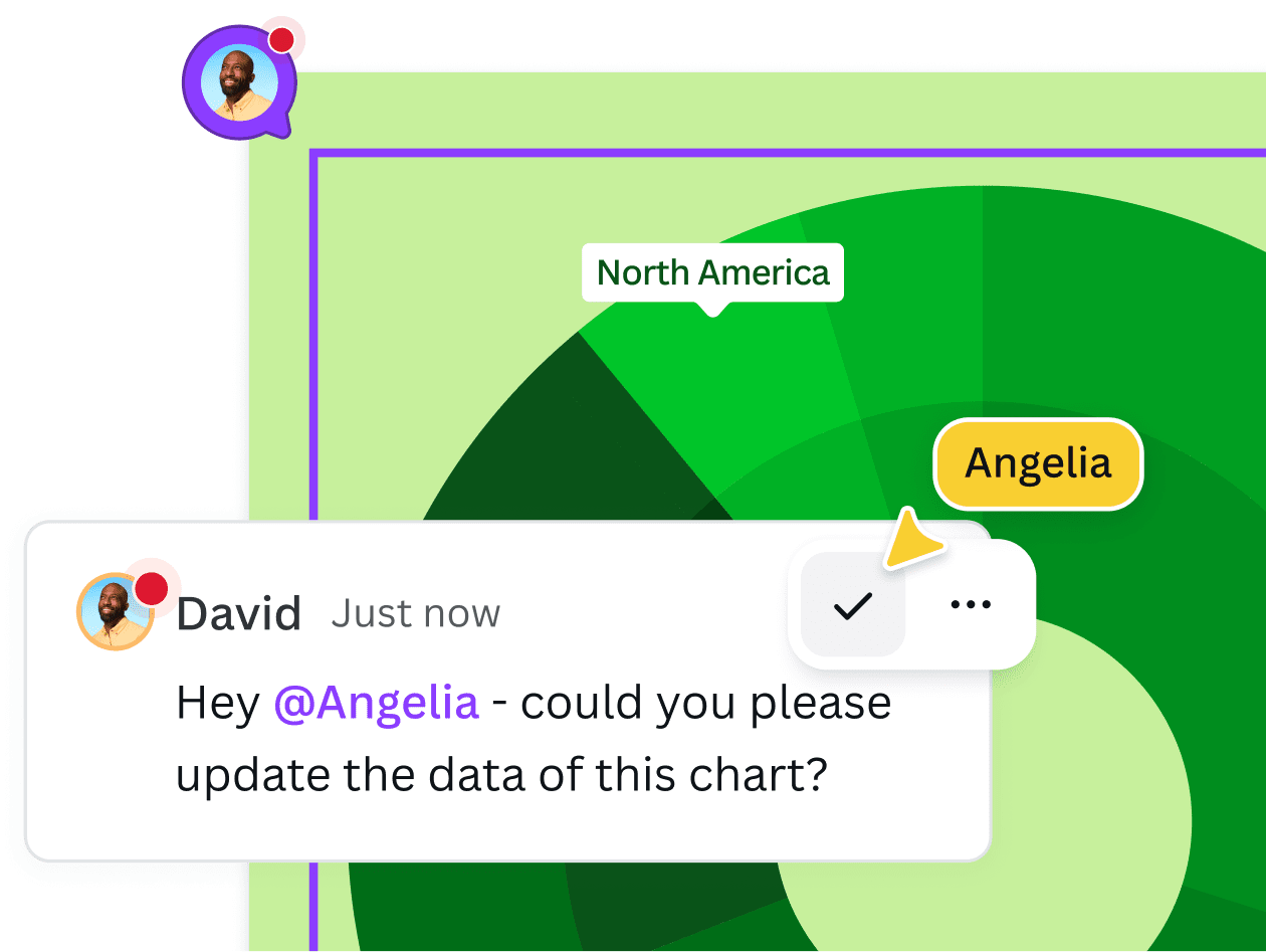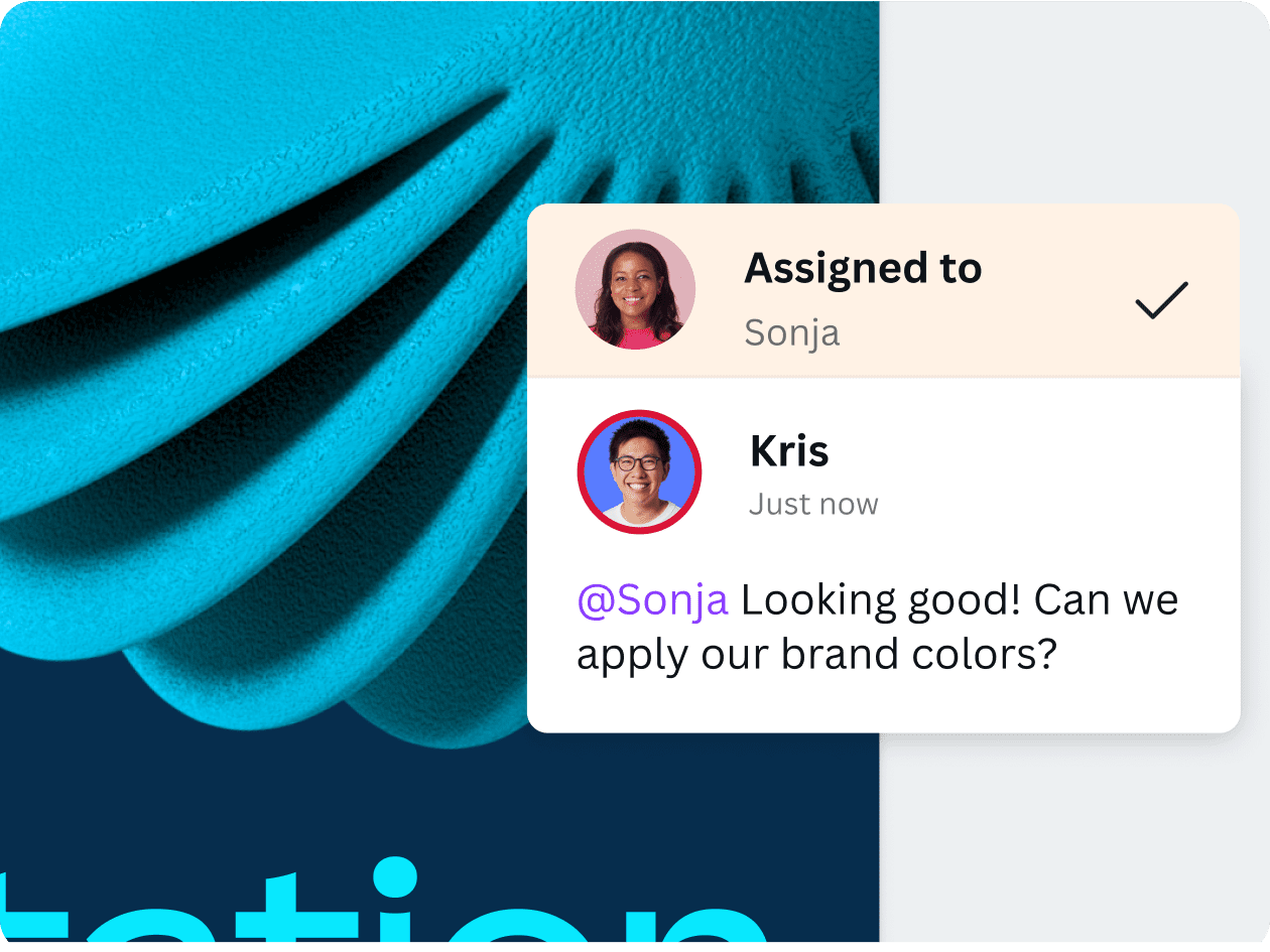 Comunícate con facilidad en cualquier diseño de Canva. Etiqueta a tu equipo para que reciban una notificación o para asignarles tareas. Reacciona a su gran trabajo con emojis y stickers.