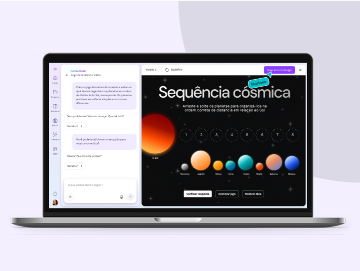 Diga adeus ao conteúdo estático! Gere widgets e elementos interativos para seus designs ou sites em instantes, sem precisar saber nada de programação. É só digitar o que você precisa, de minijogos a calculadoras de preços, e o Canva Code cria tudo para você.