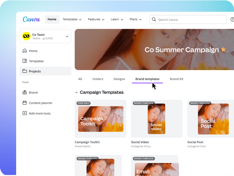Налаштуйте власні фірмові шаблони, щоб кожний співробітник міг швидко створювати фірмовий контент у Visual Suite. Оскільки кожного заохочують долучитися до формування бренда, творчі команди можуть зосередитися на тому, що в них виходить найкраще.