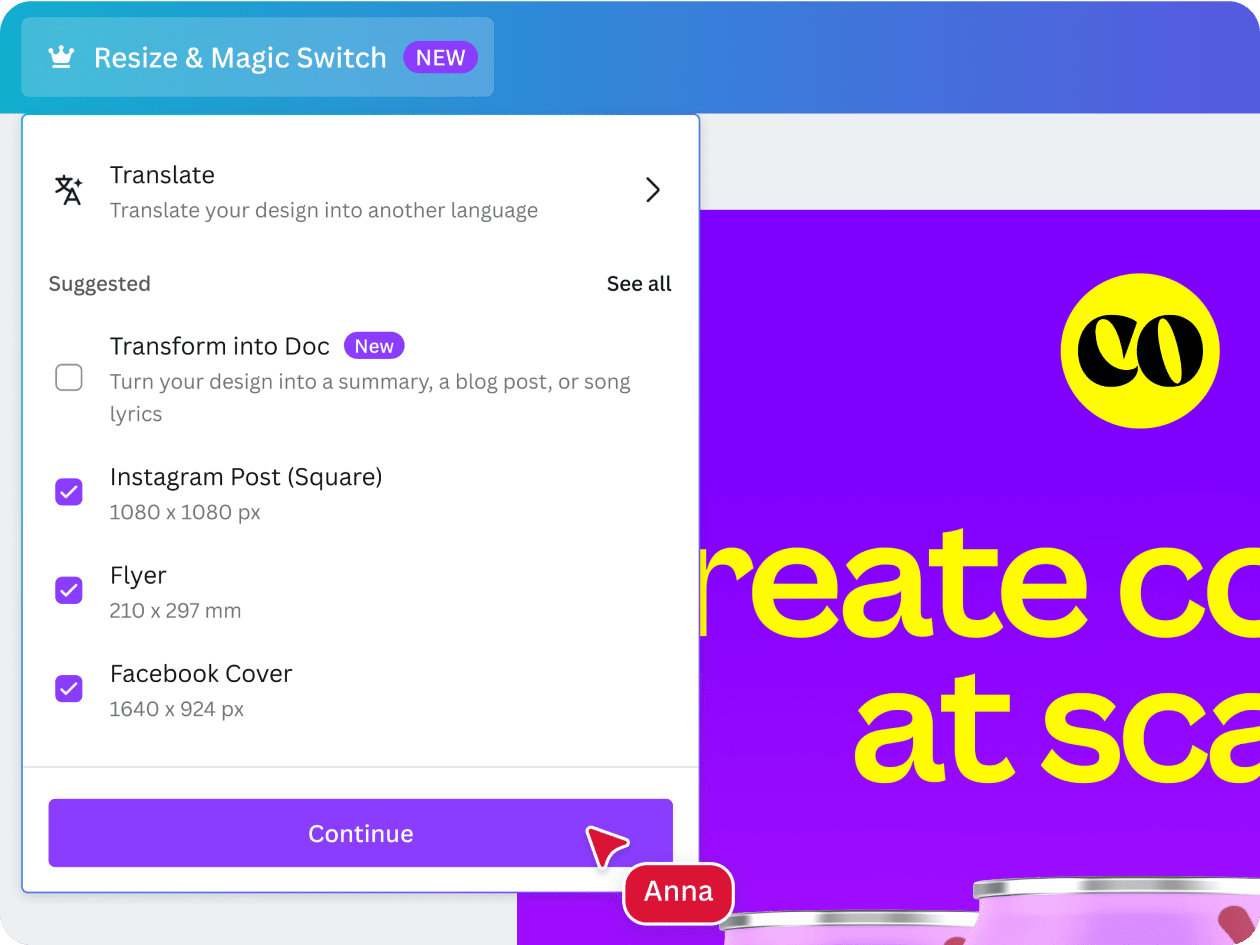 З легкістю створюйте й публікуйте контент для соцмереж у будь-якому каналі за допомогою таких інструментів, як «Зміна розміру й магічне перетворення», «Видалення фону» та «Планувальник контенту для соцмереж».