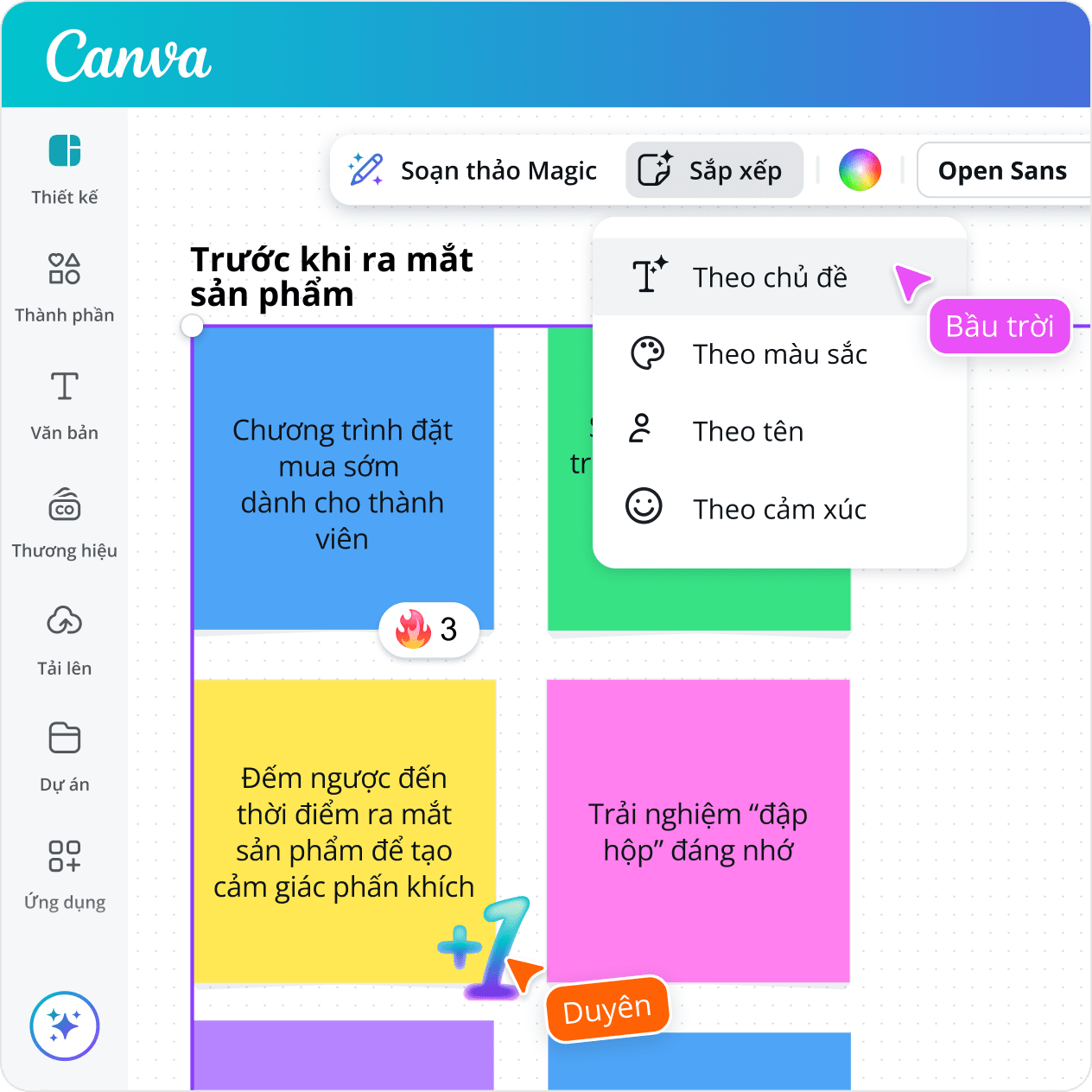 Canva giúp việc cộng tác trở nên dễ dàng. Xem nơi mọi người đang làm việc với con trỏ cộng tác nhiều màu sắc rực rỡ, theo thời gian thực. Gắn thẻ thành viên đội trong phần bình luận và giao nhiệm vụ. Cho dù bạn làm việc trong đội ngũ có quy mô ra sao, Canva đều tiếp sức cho nơi làm việc ở khắp mọi nơi để bạn luôn ngăn nắp và đạt được mục tiêu nhanh hơn.